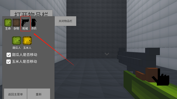 3、进入地图后,点击打开物品栏,你可以添加甜瓜人、玉米人、桌子等角色与家具,还能装备手枪、放置炸药等道具;