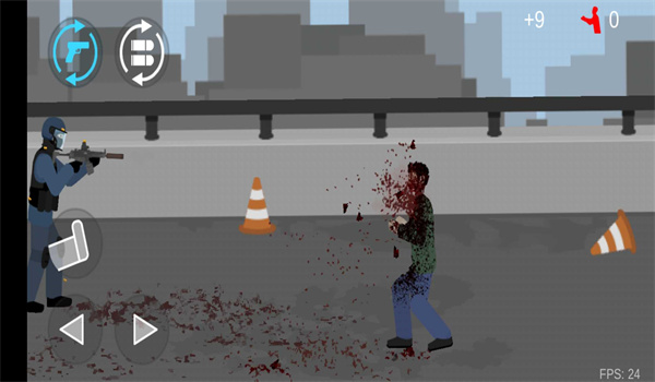 1、通过虚拟摇杆控制火柴人移动,滑动屏幕调整射击方向,精准爆头僵尸能获得额外分数。
