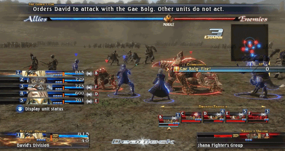 Flank-attack(侧袭):当目标已被锁定或达锁定上限时再次被攻击,将进入此状态,士气下降,无法反击,无伤害加成,指令显示为黄字“strike from the side”。