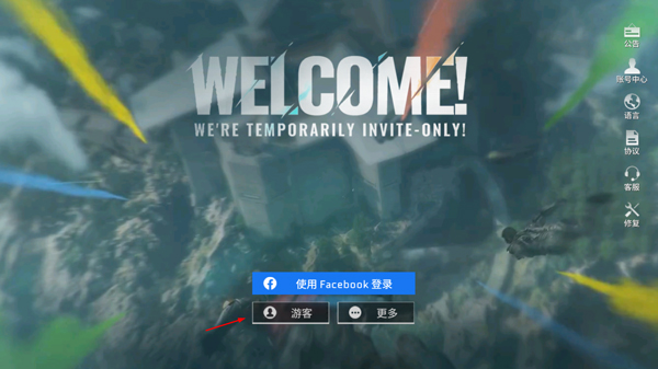 1、打开代号血战体验服客户端,注意需配合网络加速器使用,进入后点击“游客”方式登录;