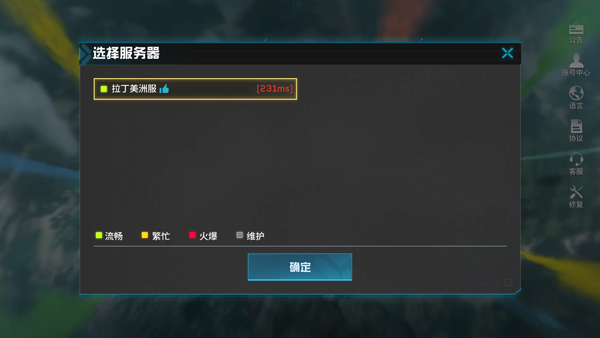 2、选择游戏服务器,目前仅开放拉丁美洲服,点击“确定”继续;