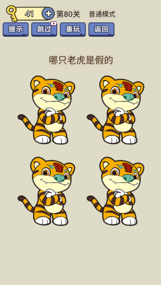 2、用手指擦掉其中一只老虎头上的“王”字,发现没有“王”字的那只就是假老虎。