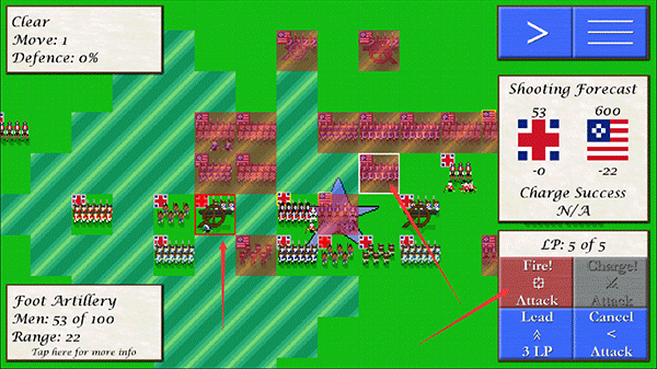 3、当敌军进入我方攻击范围时,先选中我方兵种,再点击敌方目标,随后点击“Fire”即可发动攻击;