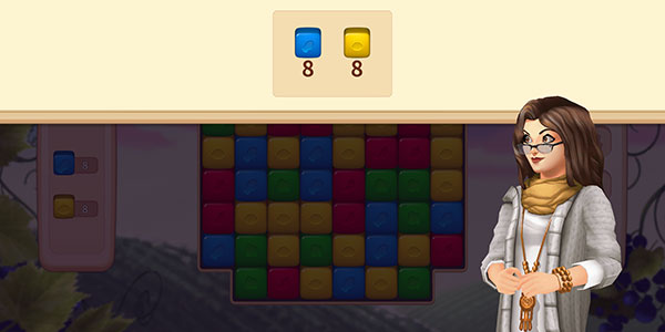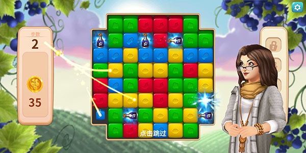 1、进入游戏后,经过简短的引导剧情,你将来到第一关。本关目标是消除蓝色和黄色砖块各8个。