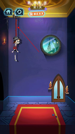 1、第一关是新手关卡,只需要根据指引,割断火柴人头上的绳子就可以了。