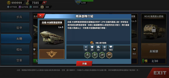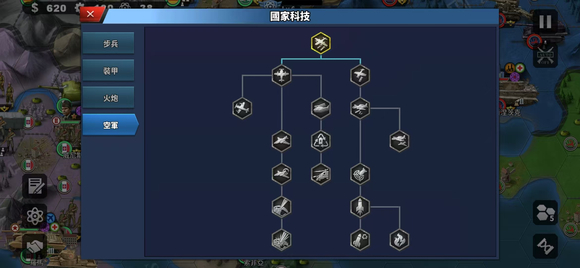 再往右一点是科研等级,它一共分为10级,每级可以建造工厂 机场等,到7回合解锁导弹发射场和卫星激光攻击系统。