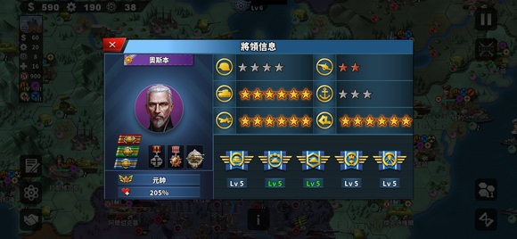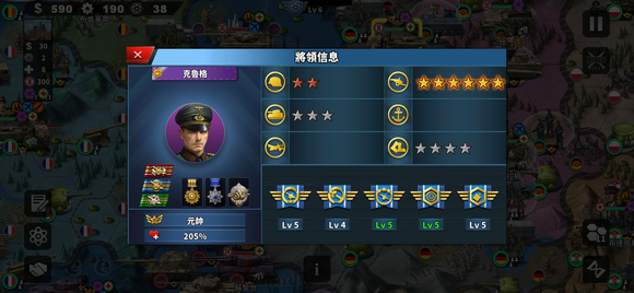 为了增强生命,游戏设置了军衔系统,玩家可以升级自己的将领军衔(花费勋章)来提高生命,并且在个人将领界面的右下角有很多蓝色技能,均为该将领的特长和相关加成,在右上侧有步兵 坦克 飞机 火炮 舰船 行军6个特长,每一颗星就可增加5伤害,比如一个坦克单位伤害为40,那么加了曼施坦因后就是65,血量也提高105%,如果移动范围是10,那么上了曼施坦因后就是16,上其他将就以此类推。