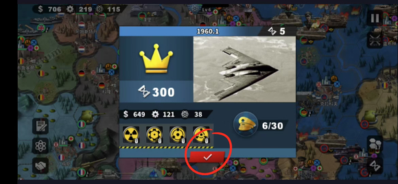 当然也不排除氪佬在这种情况下也可以完成竞速,但是大部分玩家肯定完成不了,而这个事件是如何触发的,我这边娓娓道来,在玩联合国的国家时,在第五回合开始时会进行判定,有50%概率触发该事件,一旦过了第五回合如果没有触发,后续也不会触发,因此竞速的关键就是第五回合能否不触发该事件,如果光靠概率会不会让竞速太麻烦了,因此这里有个技巧可以不触发这个决裂事件,在第五回合要开始的时候,就像这样,然后别点这个√,