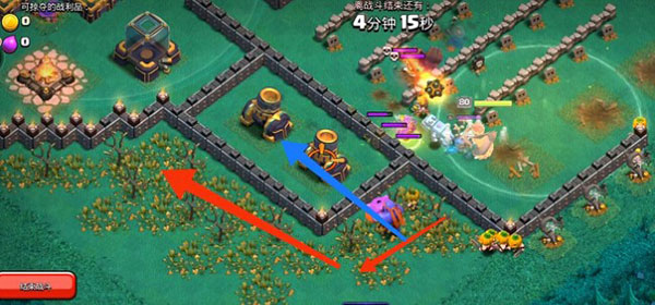 7、女王拆掉x弩后,在如图所示位置放超级蓝胖,超级蓝胖会先按蓝色箭头方向摧毁两个迫击炮,然后往红色箭头方向移动。