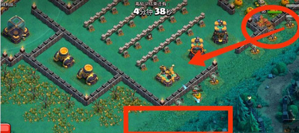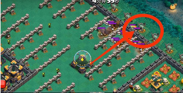 5、女王在拆炸弹塔的时候,就在下面的红色方框内下南瓜头野蛮人,10个左右就够,吸引x弩仇恨。这样可以进一步保证女王和女武神的状态良好。