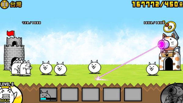 2.邪恶帝王之猫弹;对于一些玩家肯这关打不过(绿哥没错我说你呢)这一关最好的打法就是基础猫咪全上。