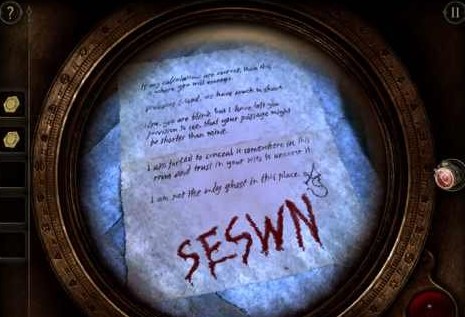 小球就装在这个巨大的指南盘。不过还不知道密码呢,其实就在一开始看的那封信上,只不过要用目镜看。始终在TheRoom系列中,普通纸质信件包含过关信息的情况其实很少见,但这里就有一个。