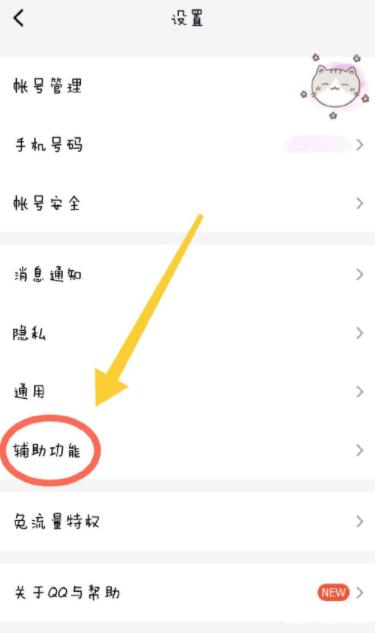 1.打开qq,点击设置,选择辅助功能;