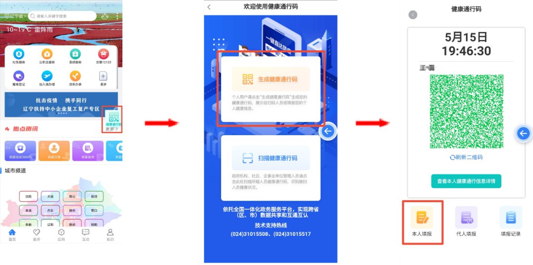自然人打开“辽事通” APP,首页面点击“健康通行码”图标后,点击“生成健康通行码”,即可生成本人的健康通行码,对于首次生成健康通行码的用户,需要点击“本人填报”填报个人健康码信息。