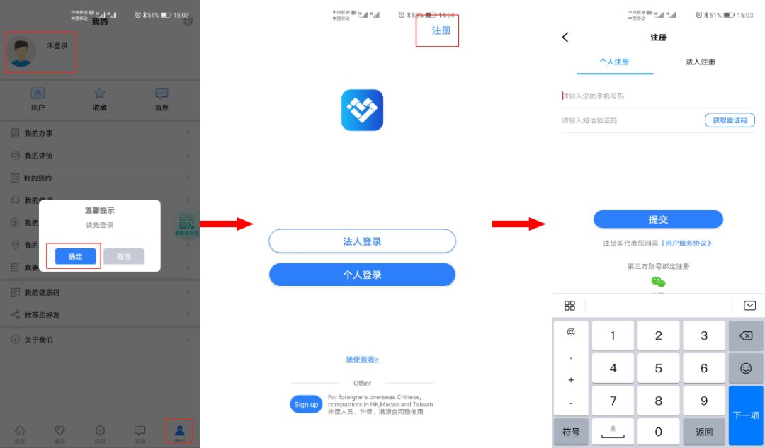 APP安装完成后,打开APP进入“我的”页面,新用户点击右上角“注册”按钮,已经注册用户直接点击“个人登录”输入手机号和密码或手机号和验证码登录辽事通。