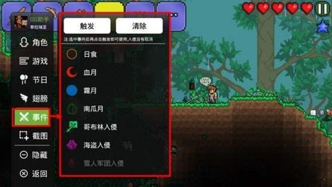触发事件功能:日食,霜月,血月,南瓜月,哥布林入侵,海盗入侵(都可以被激活)