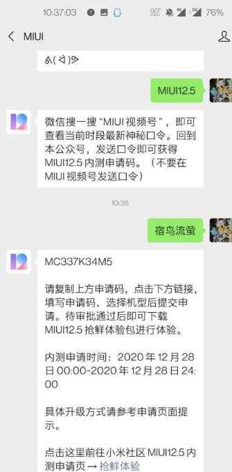 2、微信搜一搜 “MIUI视频号” ,即可查看当前时段最新神秘口令。回到本公众号,发送口令即可获得MIUI12.5内测申请码。(不要在MIUI视频号发送口令)