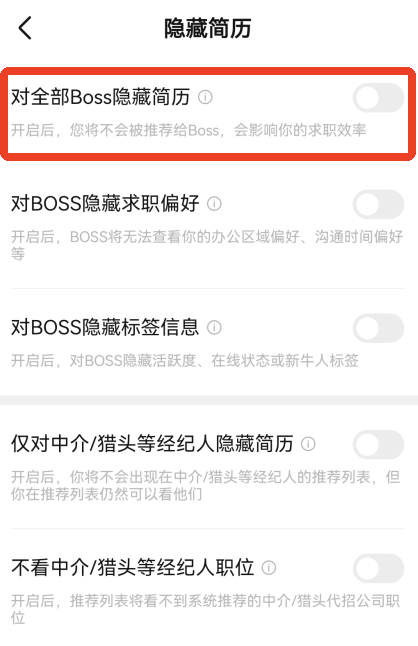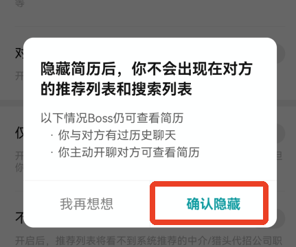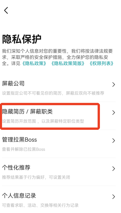 3.选择隐藏简历/屏蔽职类,这个设置可以改变简历的开放范围和屏蔽特定职位的类型。
