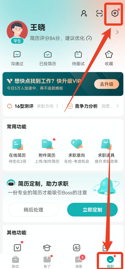 1.在【我的】页面,点击右上角的齿轮设置。