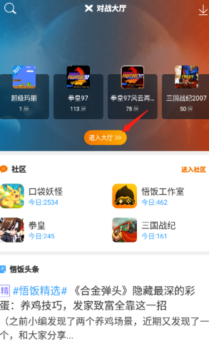 1、悟饭游戏厅是有联机对战平台的,我们打开悟饭游戏厅,点击底部的“发现”按钮,即可进入对战大厅。