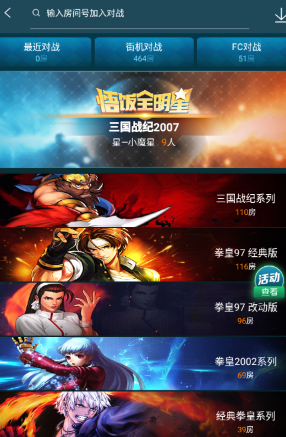 1、拳皇97、98、三国战纪、街头霸王等网络实时联机对战。