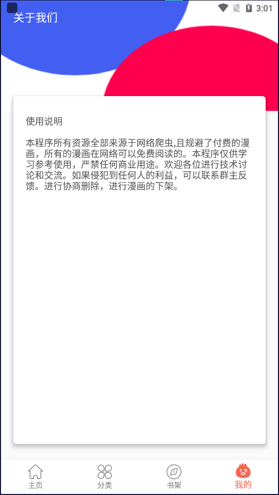 本程序所有资源全部来源于网络爬虫,且规避了付费的漫画,所有的漫画在网络可以免费阅读的。