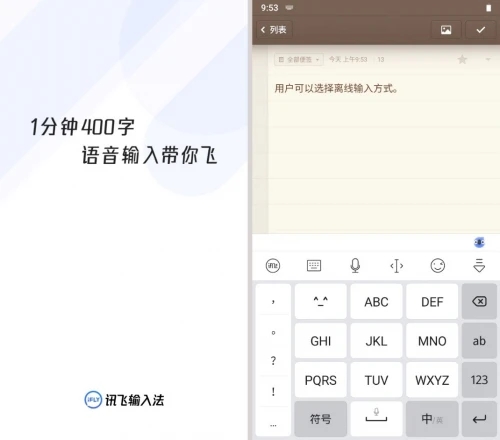 讯飞输入法这次还提供了“基本输入”和“完整体验”两种模式。前者还致力于更好地保护用户数据。用户在使用时可以使用拼音、手写等基本打字方式。同时还可以使用皮肤、表情等功能。