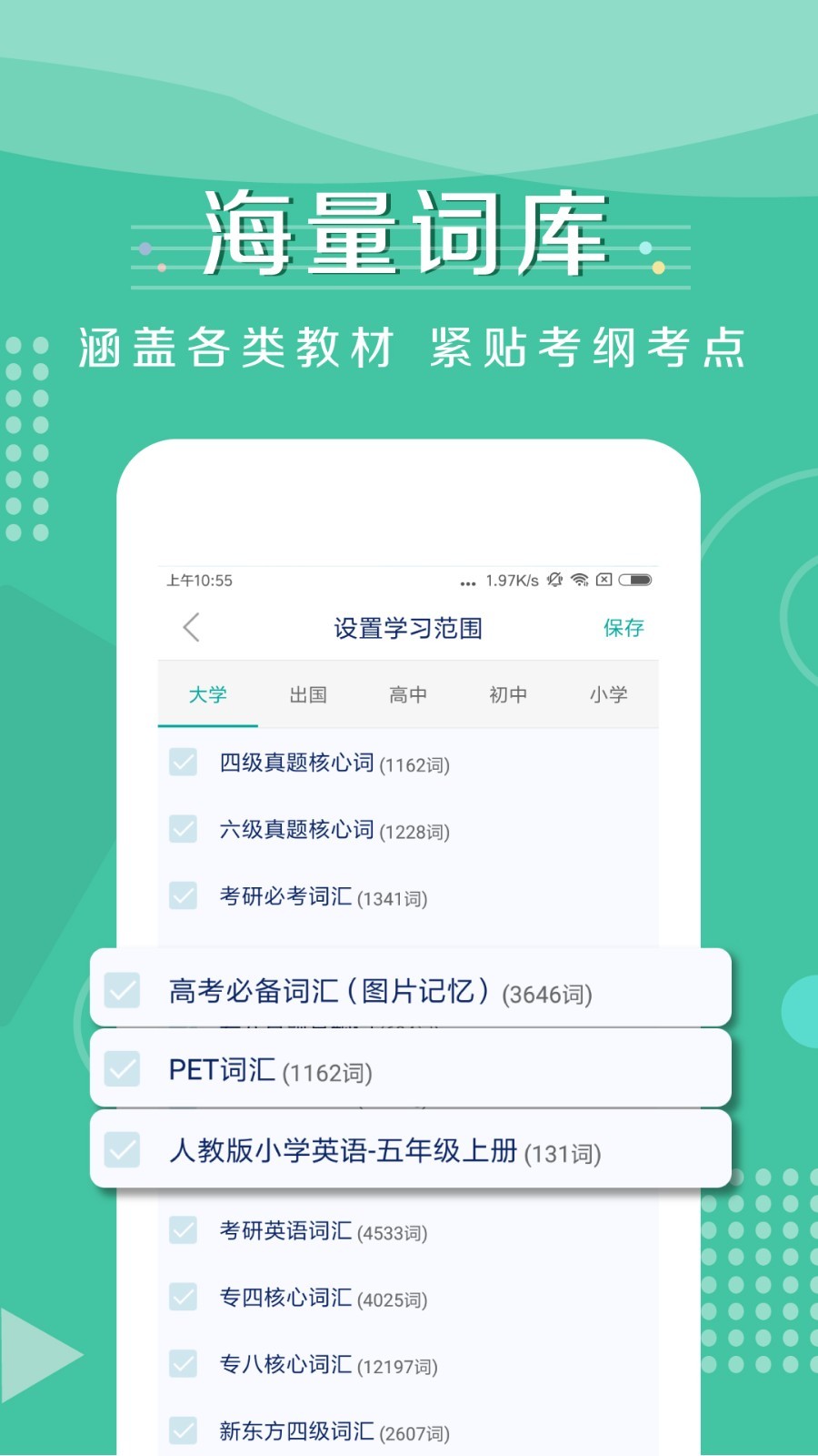 紧贴考试范围,包括小学、初中、高中、大学、四六级、考研、托福、雅思、新概念、专四、专八、PET、KET、BEC、SAT、GRE、GMAT、托业等各个阶段的英语单词库