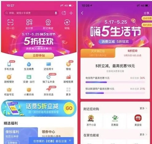 2.本地化生活服务:O2O超市,加油缴费服务,周五周六5折+营销活动多,优惠多多,方便;