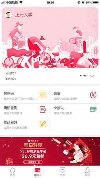 上面充值图书卡、食堂卡之类的卡片,省去出去教务处排队时间和能随时查看各类服务卡消费明细很方便。