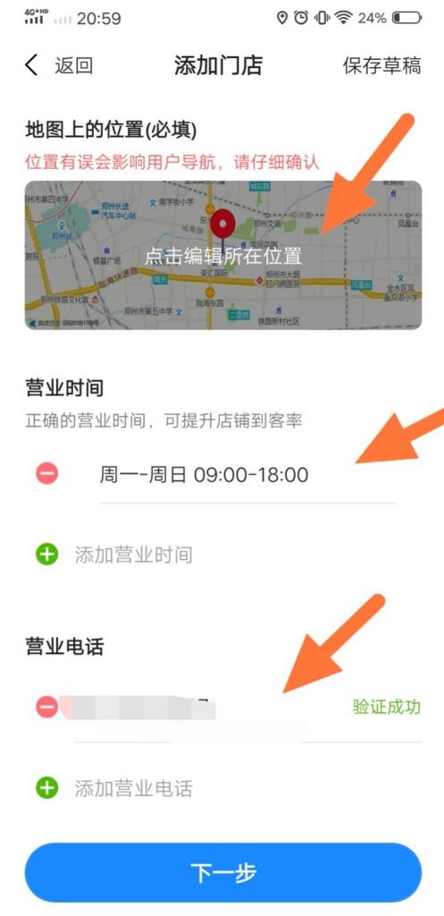然后在地图上编辑店铺位置,填写营业时间以及营业电话,如图所示