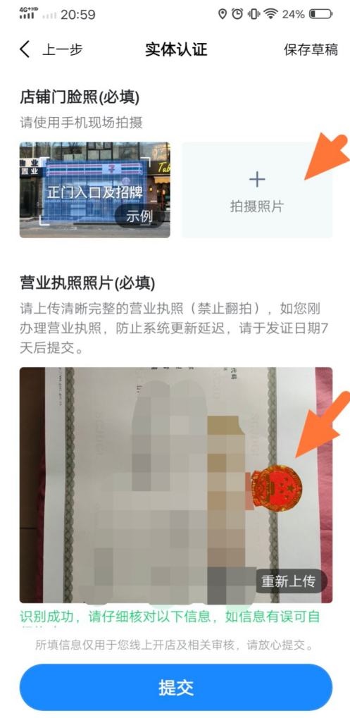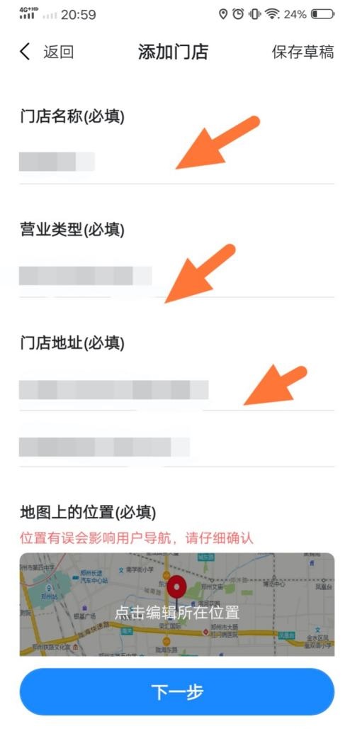 在窗口中填写店铺的名称、营业类型、地址,如图所示