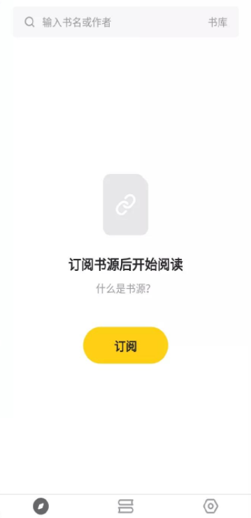 打开软件可以看的首页一片空白,你需要点击中间的“订阅”按钮来添加书源,支持默认书源导入和自定义手动导入.