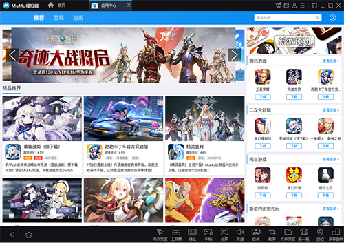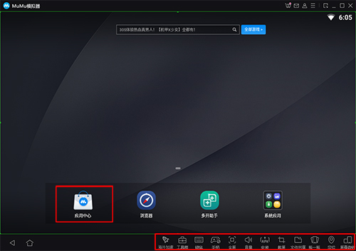 1.进入网易MuMu助手界面,可在右下角进行功能设置,点击【应用中心】