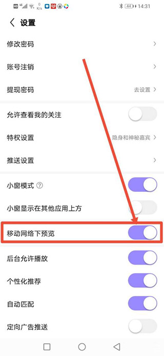 3、进入设置界面,然后把【移动网络下预览】的按钮开启即可。