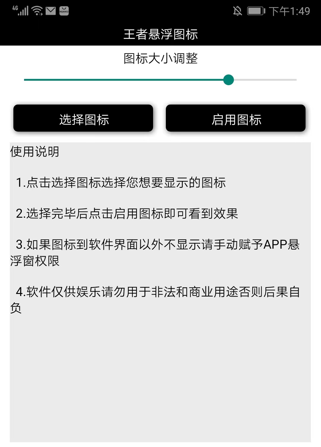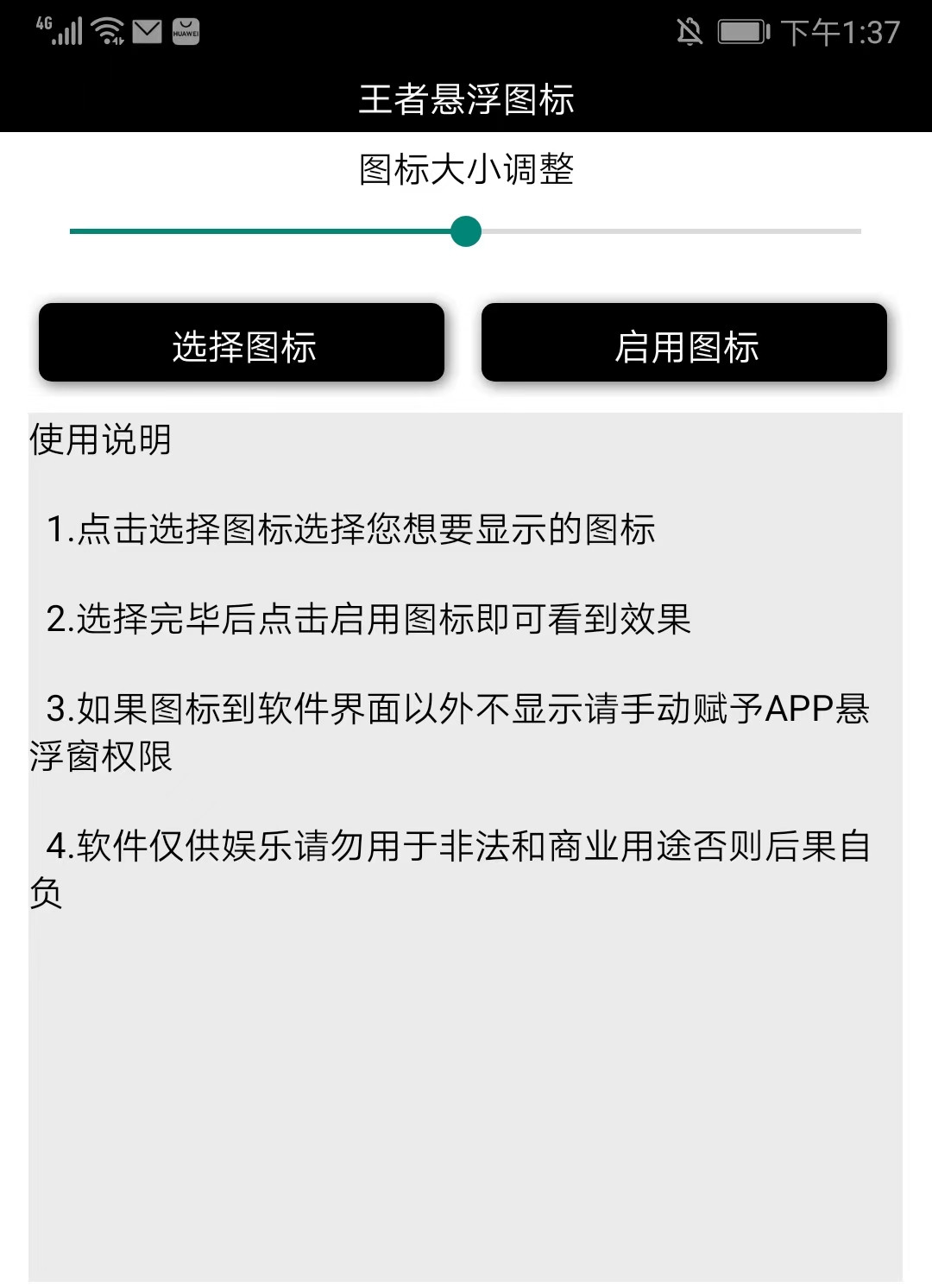 进入王者悬浮图标aapp首页,有选择图标和启动图标两个按钮