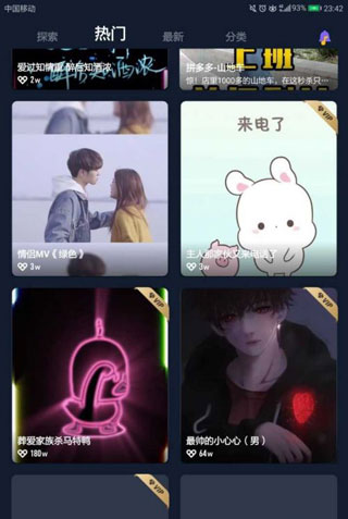 点击来电进入该页面后,可以选择探索、热门、最新或分类查看相应的来电秀