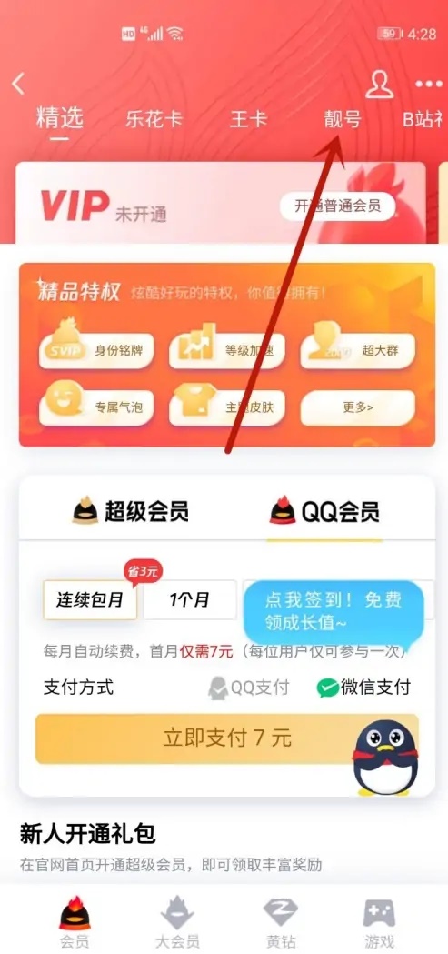 页面跳转后,点击【靓号】。