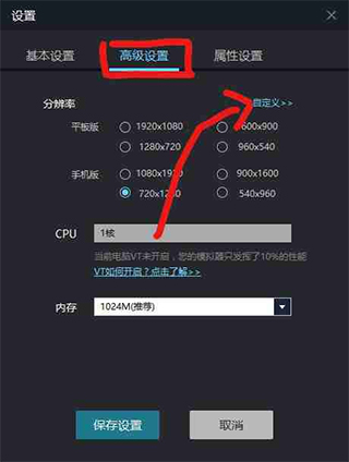 3、设置分辨率,运行辅助的分辨率要求是720*1280,点自定义——宽:720、高:1280、dPI:320(如下图)