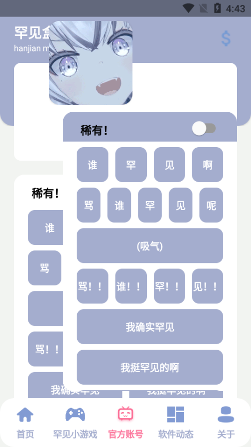 罕见盒是一款新型的语音包软件,在罕见盒6.0app中,多类型语音资源,用户可以直接点击相对应的文字就可以进行播放,音质超级清晰,还可以自行设置,快下载罕见盒试试吧!