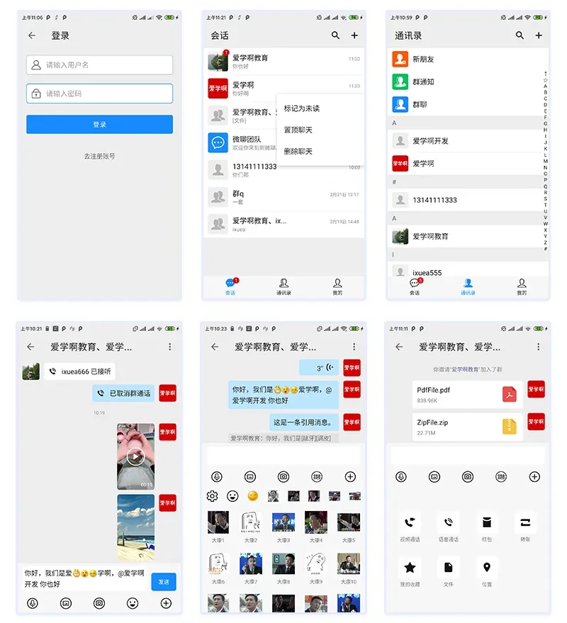 登录/对话界面/通讯录/聊天界面/自定义表情/更多界面