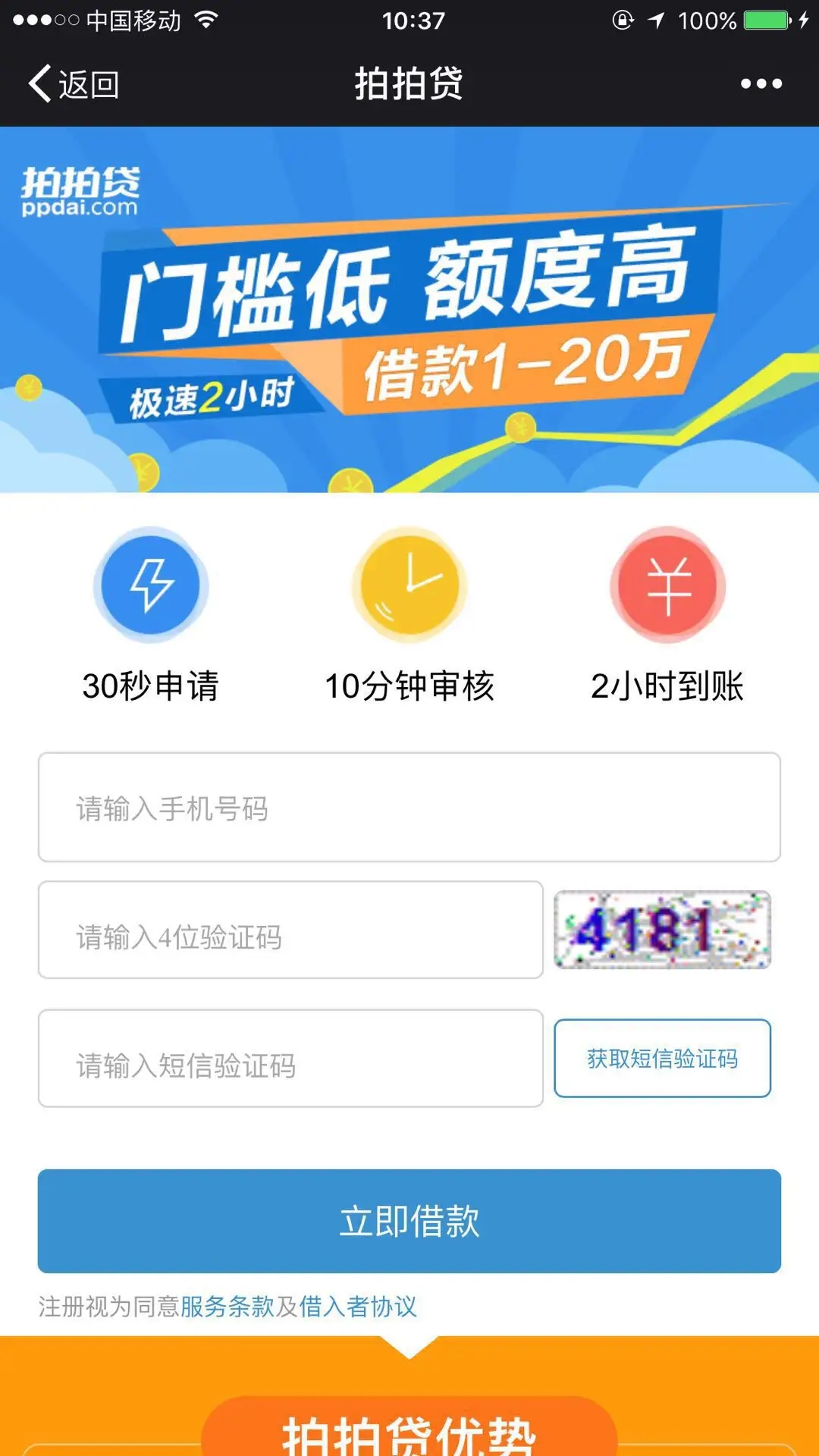 拍拍贷借款是一款无抵押免贷款的借款平台,在拍拍贷借款app中,额度高,纯信用借款,持身份证即可申请1-20万借款,极速2小时到账,全部线上操作,一键轻松借款,快下载拍拍贷借款试试吧!