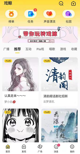 戏鲸提供众多精品剧情歌,或者剧本,用户可以在软件上找到心仪的小伙伴一起用声音表演。