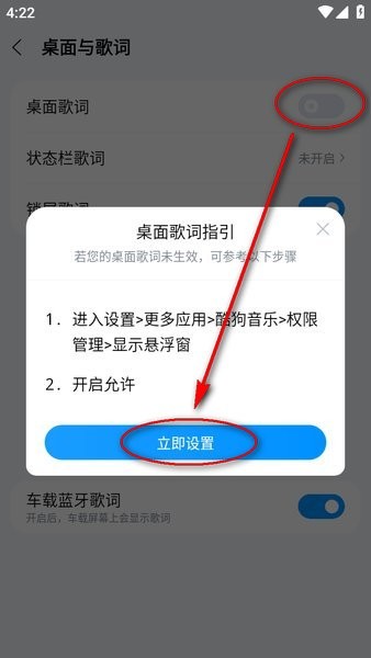 把“桌面歌词”后面的按钮打开,会弹窗提示指引,点击“立即设置”;
