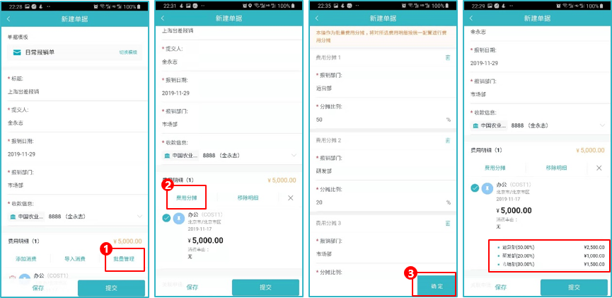 针对多部门、项目、产品线等共同发生的费用,可按照一定比例或金额进行费用分摊,在报销单里选择 ①【批量管理】-- 选择 ②【费用分摊】-- 填写分摊信息选择 ③【确定】 ,分摊完成消费明细下方看到分摊结果