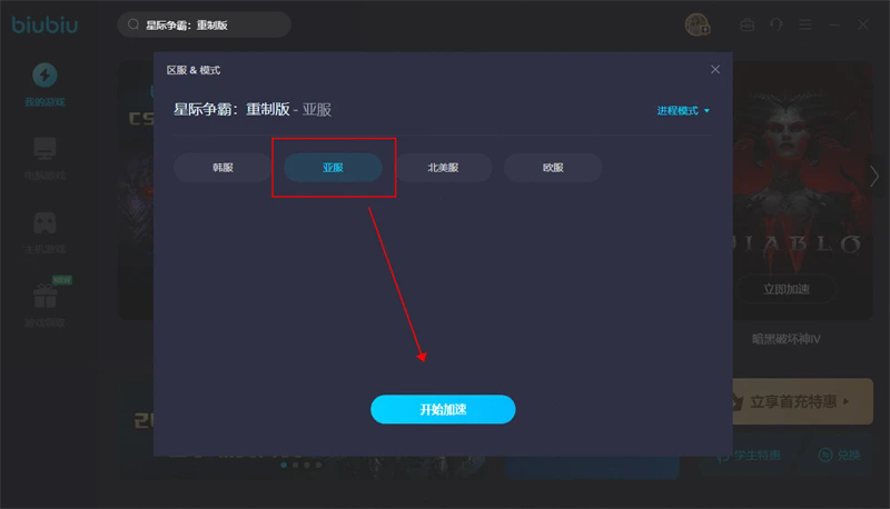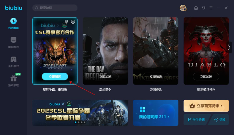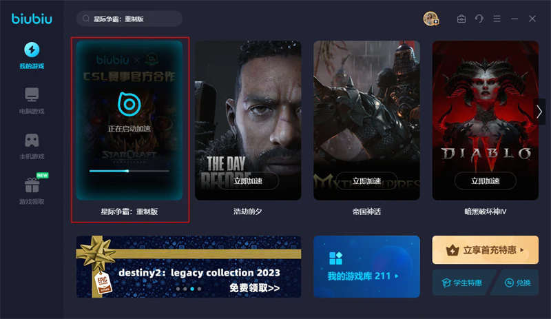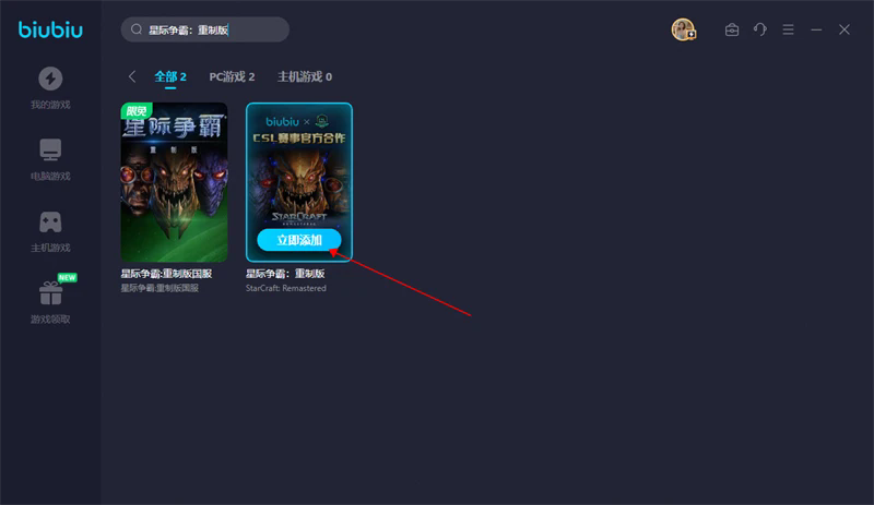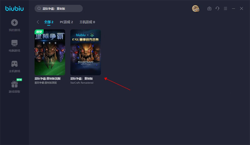 ①在biubiu加速器搜索:星际争霸:重制版(其他想要玩的游戏也可进行搜索)