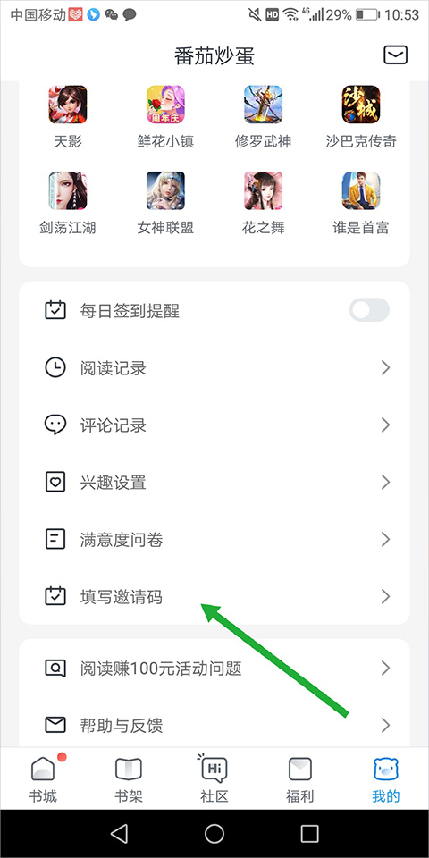 邀请码可任意设置,将此邀请码发给朋友,并让其在他手机里的米读极速版app中注册时填写即可。
