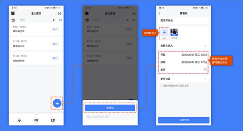 点击“+”按钮,再点击“新会议”按钮,即可创建会议。修改会议时间,即可预约会议。