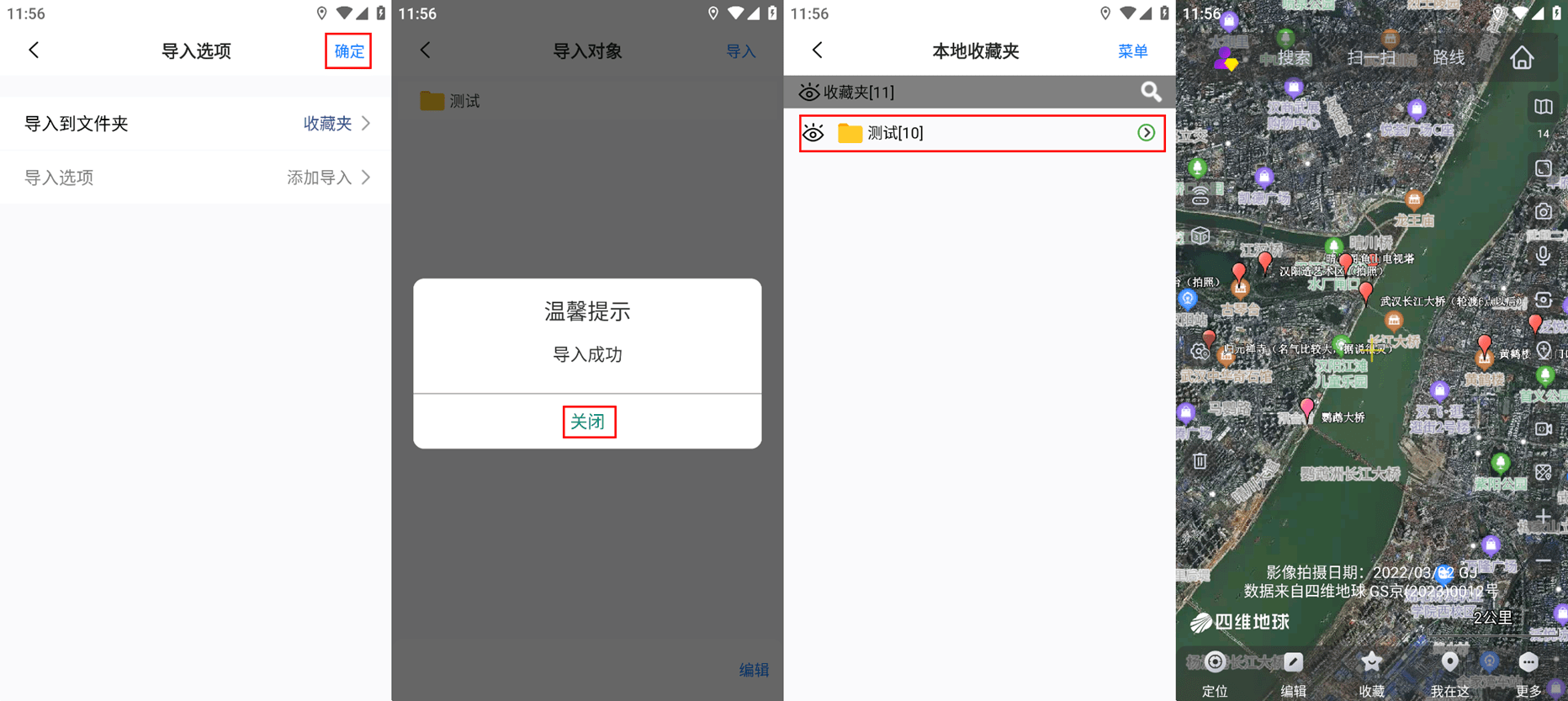 进入[导入选项]页面,点击【确定】,执行导入。导入完成后,数据会保存在收藏夹中,显示在地图上。