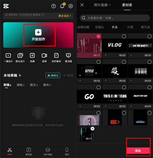1、打开剪映,点击开始创作,添加素材开始新建剪映作品。